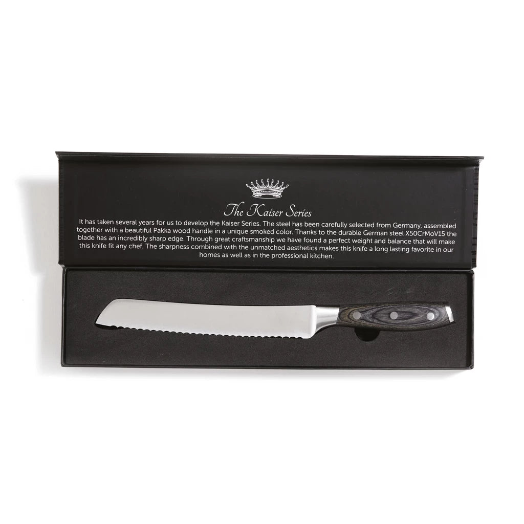 Eksklusiv brødkniv fra Kaiser-serien. Stålet er nøye utvalgt fra Tyskland, X50CrMoV15 og håndtaket er av Pakkaträ. Håndtaket er lett å gripe, som sammen med sin velbalanserte kropp fra ende til egg gjør det mer komfortabelt og lettere å jobbe med. De gode egenskapene til det tyske stålet betyr at bladene både er flekkbestandige og ikke krever høye vedlikeholdskrav mer enn sliping.